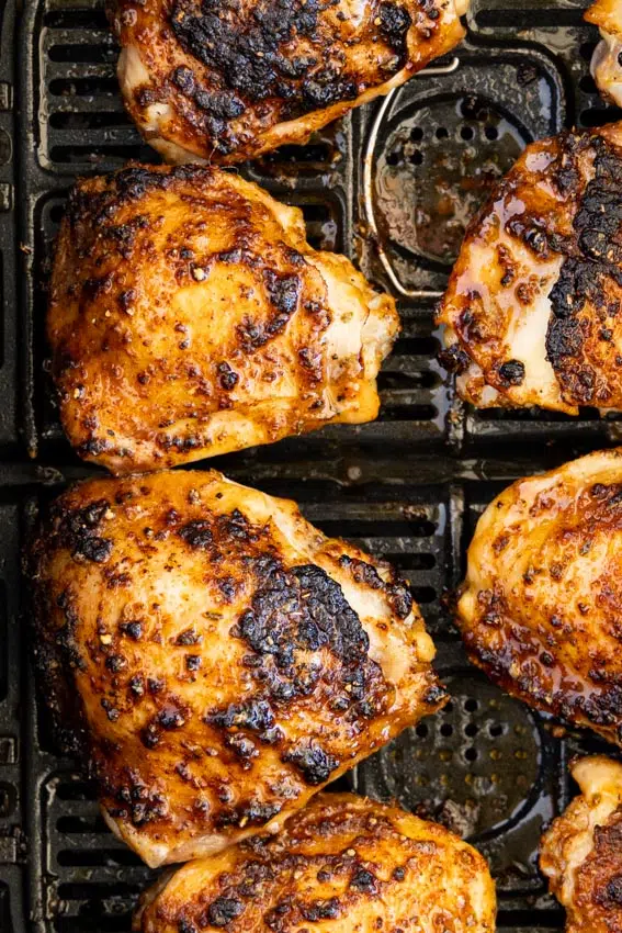 These air fryer chicken thighs can be marinated and kept in the fridge for up to 24 hours before cooking. Leftovers can be kept in the refrigerator in an airtight container for up to 3 days. This recipe is great for meal prep as the chicken thighs keep really well and are easy to reheat in the microw