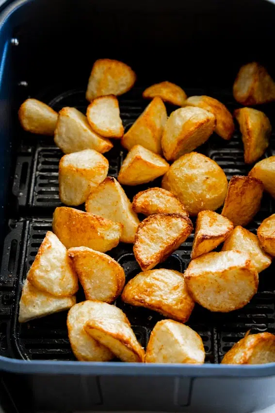 Roast potatoes are the ultimate side dish. You’ll be hard-pressed to find a single person who can resist a crunchy, golden roastie. This easy air fryer recipe means you can have roasted potatoes any night of the week as a side dish for anything from baked chicken breasts to pork chops. They are also perfect served with roasts and no festive feast will be complete without a platter of hot, crunchy potatoes.