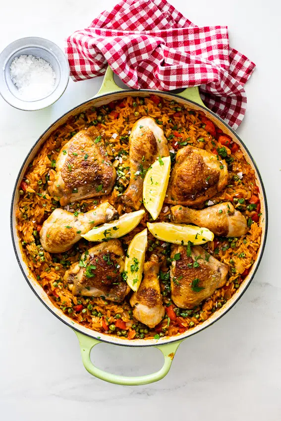 Arroz con pollo is the perfect one pot dinner recipe. Fragrant Spanish chicken and rice cooked with onions, peppers and peas is guaranteed to be a winner.