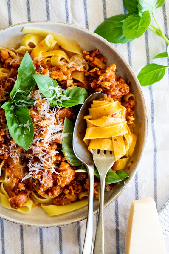 Easy chicken Bolognese with bacon is the perfect weeknight dinner recipe that can be ready in 30 minutes. It’s a little lighter than classic bolognese sauce but is no less delicious thanks to the addition of smoky bacon and loads of herbs.