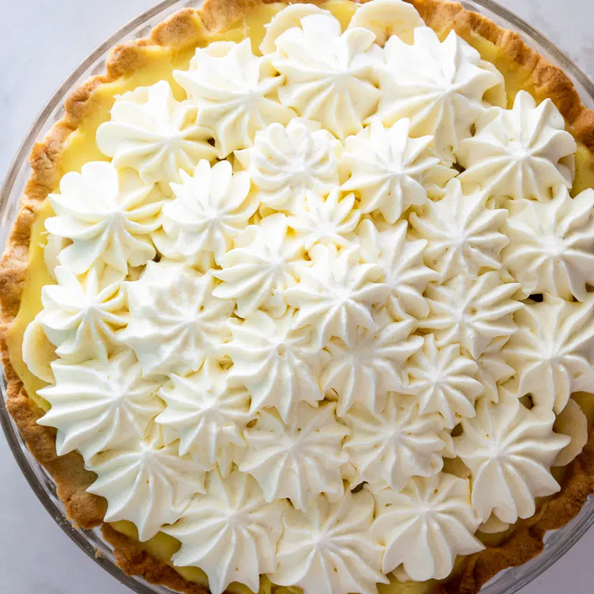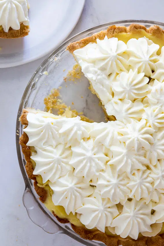 - Whipped cream: No cream pie is complete without a mountain of whipped cream on top. For the perfect homemade whipped cream, whisk heavy or whipping cream with powdered or icing sugar. If using a mixer, use the slowest speed. This might take longer but whipping cream slowly creates more stable air bubbles that won’t collapse quickly and cause the cream to split and weep. Pipe the cream onto the banana cream pie with a star tip nozzle or simply dollop on before slicing and serving.