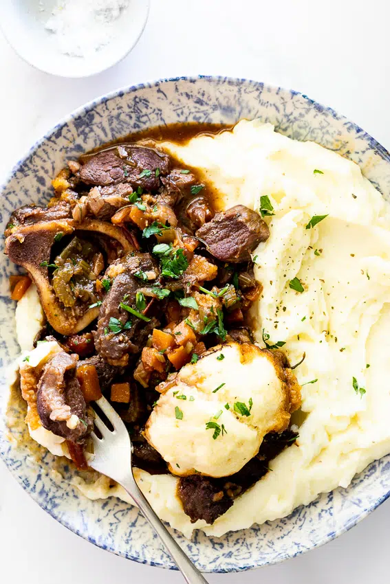 This slow-cooked beef shin (beef shank) stew is rich and flavorful. It is the perfect comfort food recipe served with fluffy Parmesan dumplings and creamy mashed potatoes.