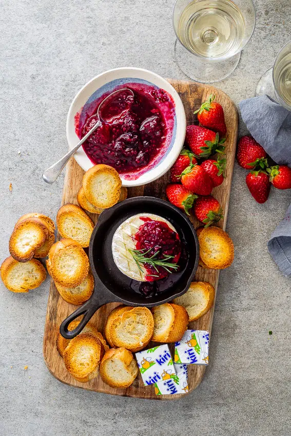 - Remove the cheese from the oven then serve topped with the berry compote with crostini/baguette.