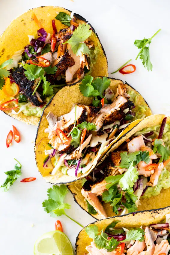 Tacos are incredibly versatile and the fillings are completely up to you. Classics like salsa, pico de Gallo or guacamole are obvious choices but avocado crema, cotija cheese and my delicious corn salsa recipe will all be delicious with this salmon tacos recipe.