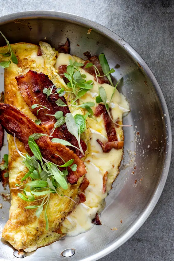 Bacon omelette with soft Brie cheese is a delicious gluten-free recipe. Omelettes are perfect as a quick and easy any time meal.