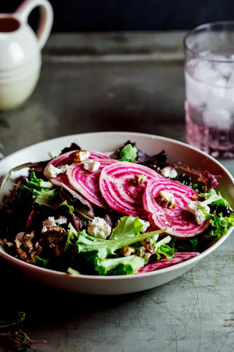 Candy-Striped beetroot salad with Maple-candied pecans and goat’s cheese