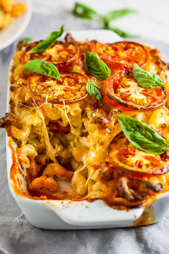 When you have kids, you probably eat an awful lot of mac and cheese. And even though I love macaroni and cheese (like, really love), there’s only so many times I can eat it before I get tired of it. Thus, I am forced to come up with interesting flavor additions to make this family staple a bit more interesting. Not only for us adults but also for the kids. I want them to be exposed to more than just carbs and cheese. And that’s how this baked Caprese mac and cheese was born.