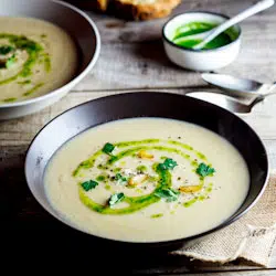 Smooth and silky celeriac and potato soup flavoured with roasted garlic and finished with a bright green parsley oil to add a little freshness.