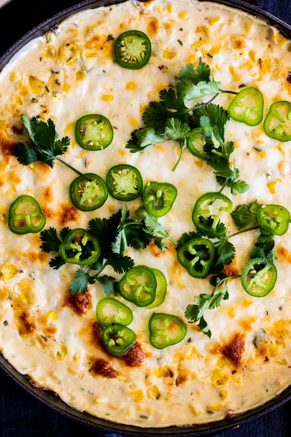 Made with four cheeses and flavored with jalapeño and chives, this cheesy hot corn dip is a fantastic appetizer served with corn chips. It’s perfect for any occasion and will be a hit with anyone you serve it to.