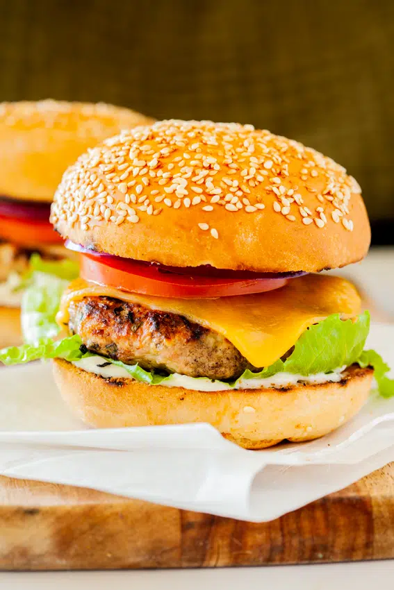 - Assemble the burgers: Split and toast the buns then top with mayonnaise, lettuce, the grilled turkey patties, cheese, tomato and onion. Serve immediately.