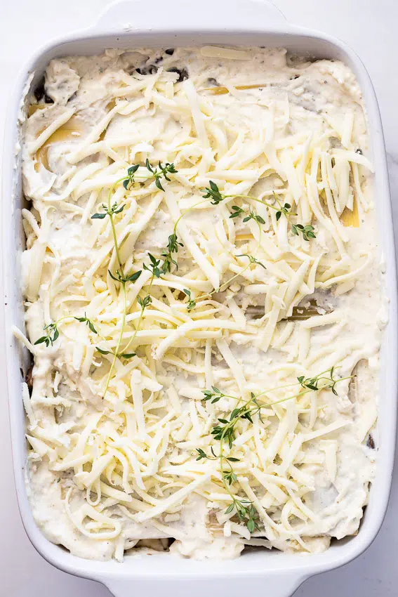 - Assemble the lasagna by layering the mushrooms, cheese sauce, pasta sheets and grated cheese in a baking dish. Cover with foil and place in the oven.