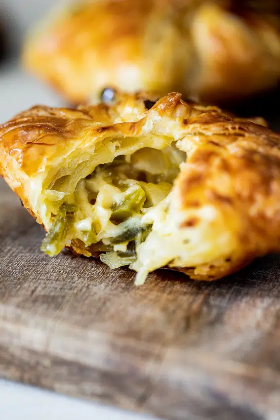 Using shop-bought frozen puff pastry makes this recipe very easy. Simply defrost the pastry overnight in the refrigerator. The filling is made by sautéeing an onion until soft and translucent then combining with grated mature cheddar and mozzarella and chopped pickled jalapeños. Use a mini muffin/pastry tray and lay small squares of pastry in each hollow then fill with the cheese mixture. Fold the corners over and pinch together then brush with egg and bake until golden, puffed and cooked through.