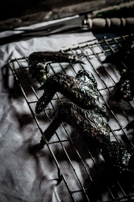 I know. These chicken wings don’t look like anything you would drool over. But that’s kind of the point with Halloween, right? There’s something quite charming about food that’s made to gross you out. Like making red pepper hummus and calling it “Brain Puree” and serving it with crudite or simply labelling Prosciutto “Cured Epidermis” (Clever Martha Stewart!).