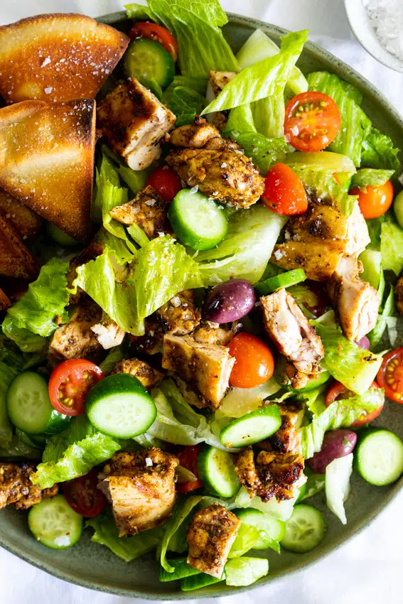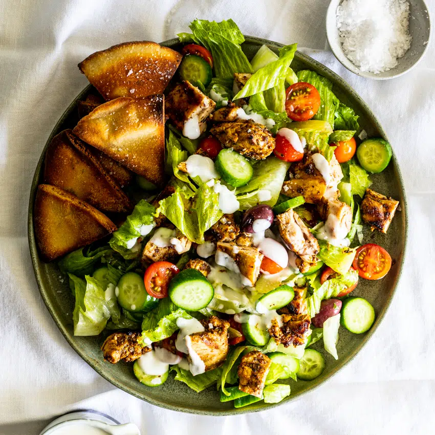 Level up your chicken salad with this easy, delicious and healthy low-carb recipe. Juicy chicken shawarma salad with yogurt lemon dressing and crispy toasted pita bread will be your new favorite recipe for a simple lunch or light dinner.