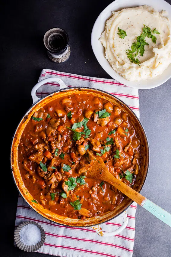 Chicken, tomato and mushroom stew with garlic Parmesan mash