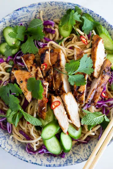 Any crunchy veggies will work in this Chinese chicken salad recipe. Of course cabbage and carrots are a good base to work from but feel free to add bean sprouts, spinach, kale, bell peppers, sugar snap peas, spring onion/green onion and even beetroot. When I make this for a quick lunch, I like using a bag of store-bought slaw mix and the one I like most has julienned beetroot and it’s delicious. You want approximately 6 cups of shredded/julienned vegetables to serve 4 people so go ahead and customise the amounts you add of each vegetable to your own preference. Shredded chicken, toasted peanuts and fresh cilantro/coriander add some healthy protein, fat and an extra boost of flavor.