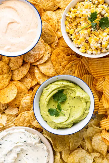 Chips and dip is the perfect, easy snack for entertaining a crowd. Make a variety of dips, add all your favorite chips and serve on a big platter.