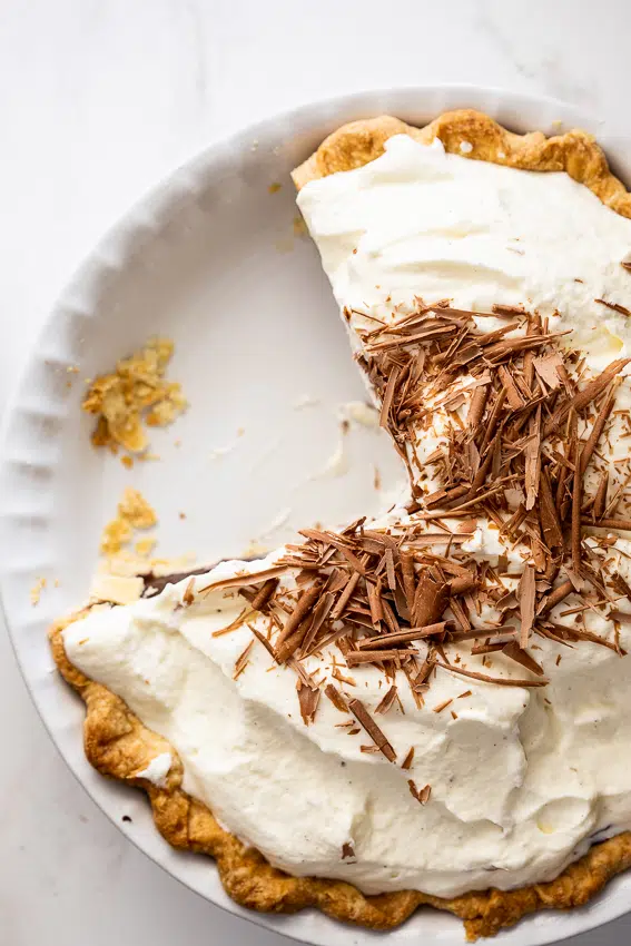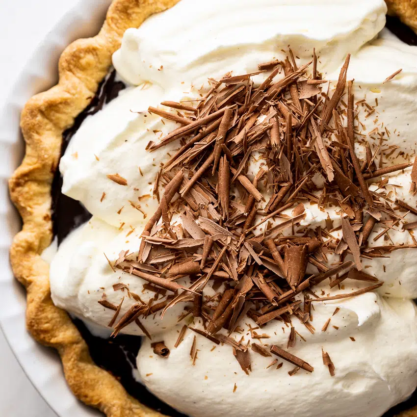 - Serve: When you are ready to serve, make the whipped cream topping. Whip the cold cream with the icing sugar until soft peaks form. Dollop and swirl onto the pie. Top with chocolate shavings or chocolate chips and serve.