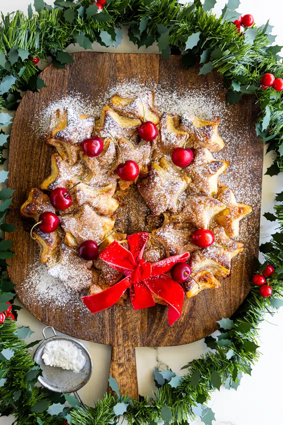 I love a good last-minute recipe and this cheerful star puff pastry wreath is exactly that. Layers of store-bought puff pastry, butter and cinnamon sugar baked into a festive wreath is the perfect easy Christmas morning breakfast or emergency snack when unexpected guests turn up.