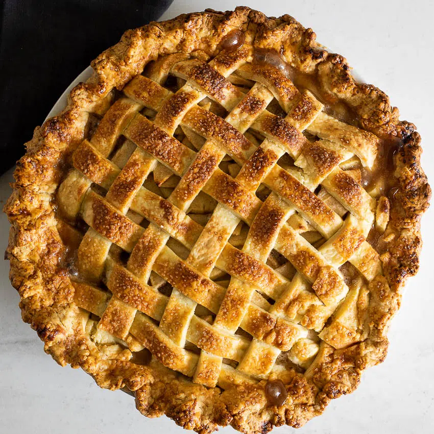 The flour helps the apple filling to thicken up so you don’t have a watery pie at the end. Top with lattice crust, brush with egg wash and sprinkle with a little extra sugar then bake until golden brown and bubbling. Remember to allow the pie to cool down before slicing as this will help the sliced pie keep its shape. Serve with the cinnamon whipped cream or a scoop of vanilla ice cream.