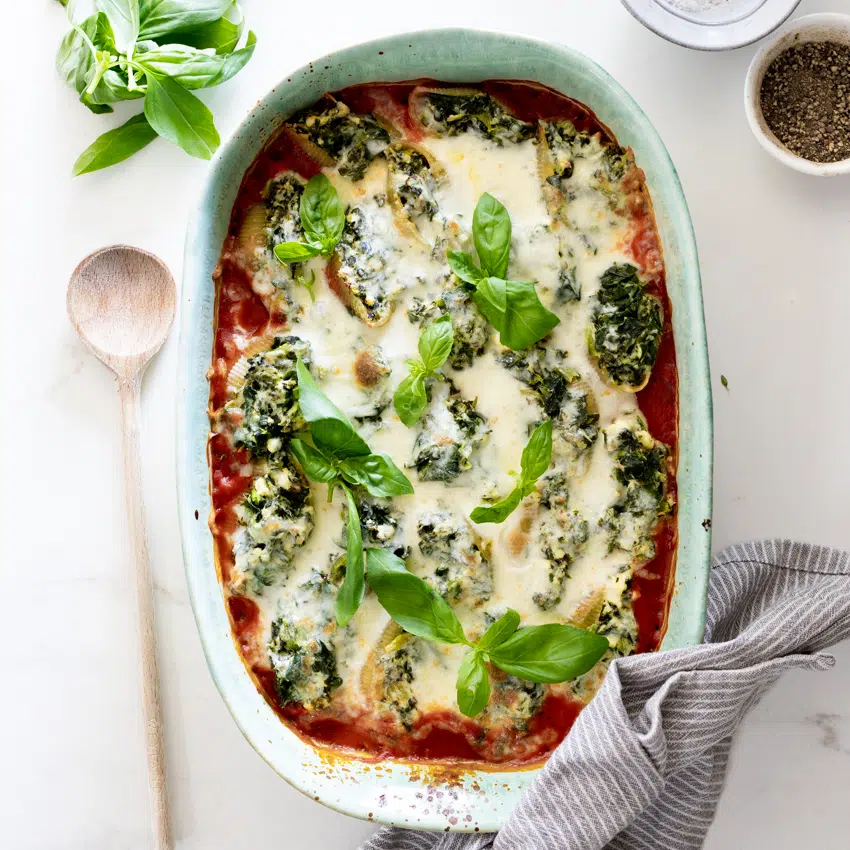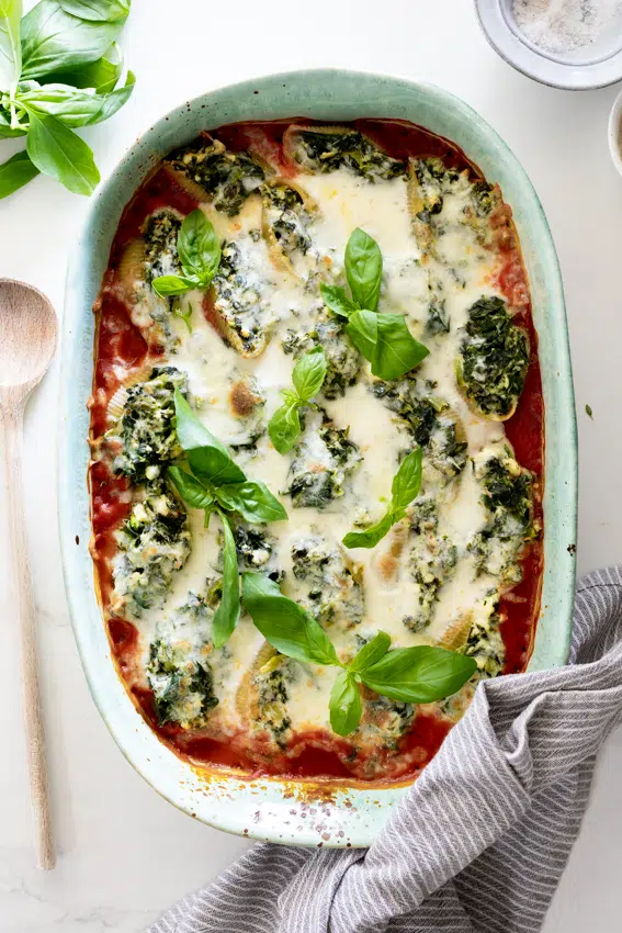 Super cheesy spinach stuffed shells baked in tomato sauce is a delicious and easy vegetarian dinner recipe everyone will love.
