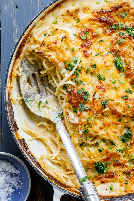 We of course have our favorites like this Rosemary-cream chicken pasta and this totally delectable tomato-cream rigatoni but we all want something new from time to time, don’t we? Last week I was planning on making a classic mac & cheese but when I went to cook the pasta, realized I didn’t have any macaroni in the house. All I had was a pack of spaghetti and so that would have to do. And so, my creamy baked spaghetti was born.