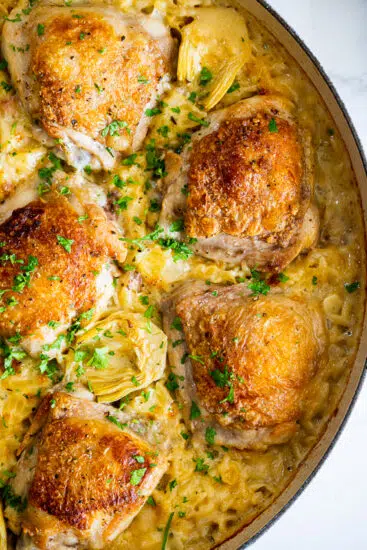 - Simmer until reduced, season and add the chicken and artichokes back in.