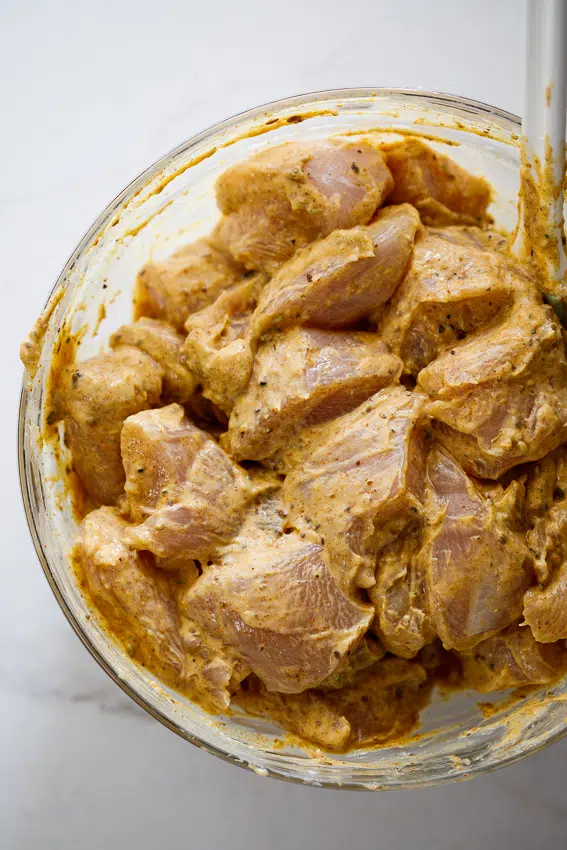 - Marinate the chicken: Mix together plain yogurt (I like using Greek yogurt), ground cumin, coriander, cardamom, turmeric and cinnamon. Add crushed garlic and ginger and season with salt and pepper. Slice boneless chicken thighs or chicken breasts into bite size chunks and place in the marinade. Mix well then cover and place in the fridge for at least 20 minutes but up to 24 hours. The longer you allow the chicken to marinade the more tender and flavored the chicken will be.