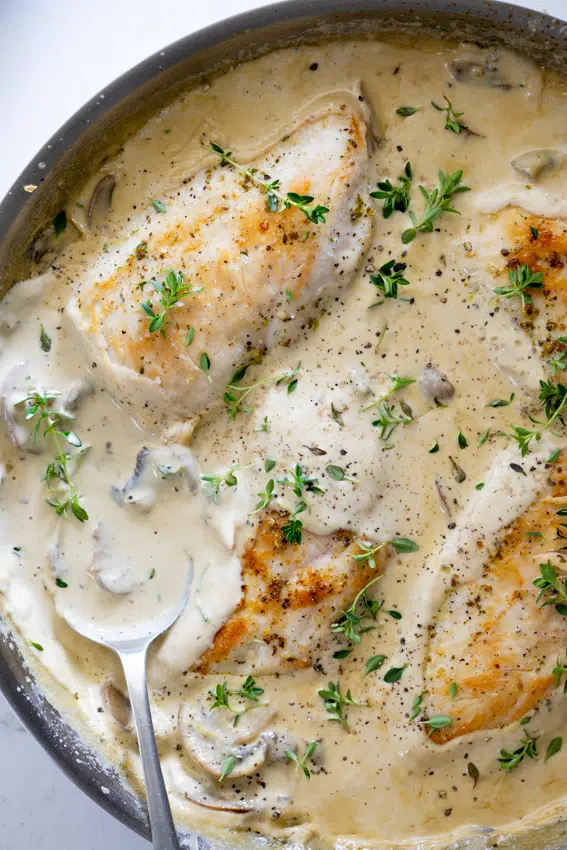 - Make the sauce: In the same pan, add a splash of oil and add the mushrooms. Cook until golden brown. Add the garlic, thyme and chilli flakes and cook until fragrant. Pour in the cream and lemon juice then allow to simmer for 5 minutes before seasoning to taste. Stir in the Parmesan cheese and add the chicken back into the. Allow to simmer for another 3-5 minutes until the chicken is cooked through and the sauce has thickened. Serve with your choice of side dishes.