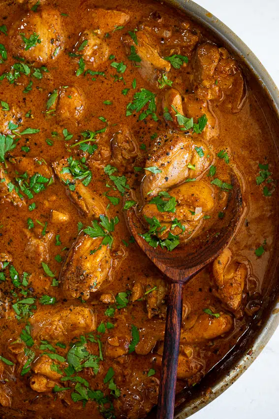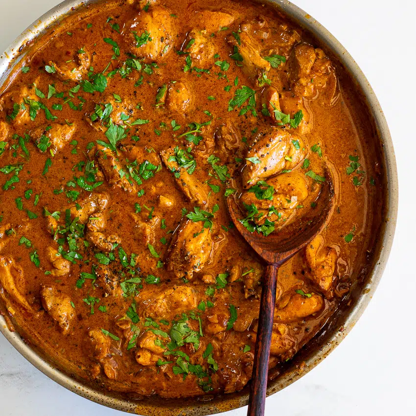 The chicken can be marinated for up to 2 days in an airtight container in the fridge. Any leftovers can be kept in the fridge for up to 2 days. Reheat in a pan with a splash of water to thin out the sauce.
