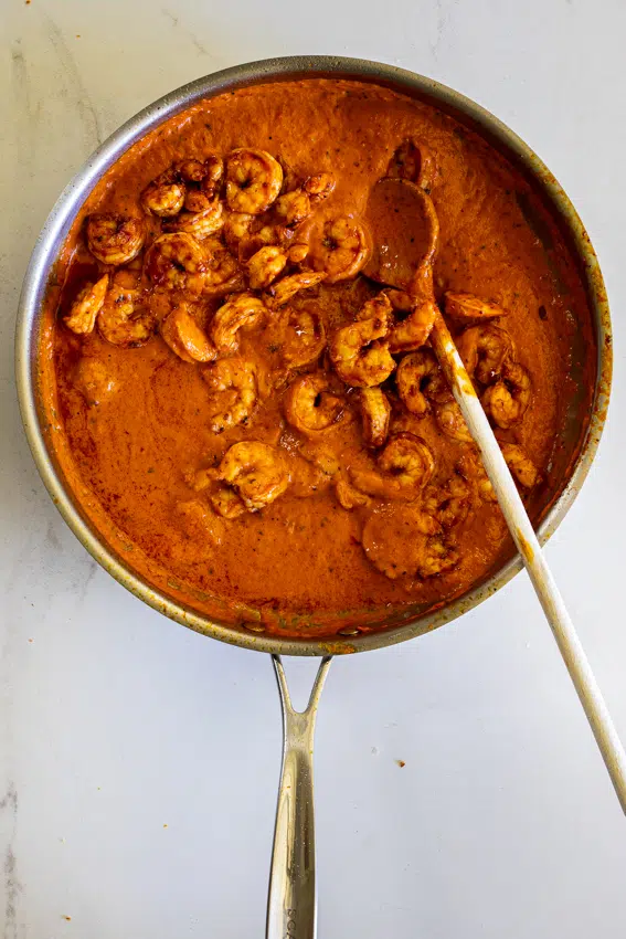 - Transfer the prawns to the sauce and stir to combine.