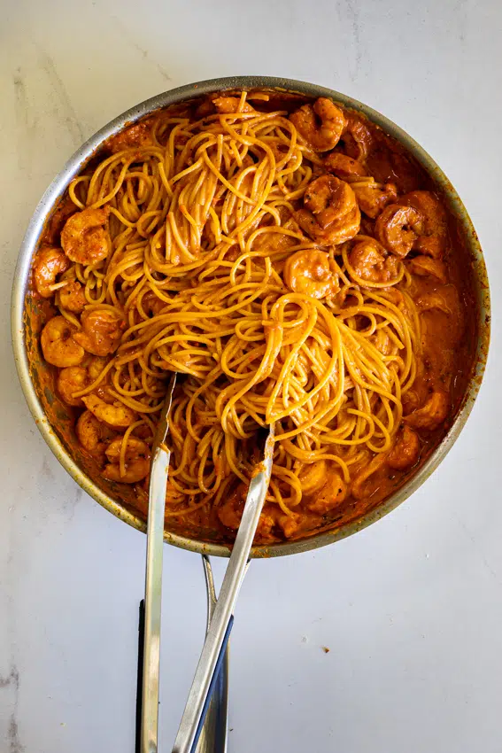 - Toss the drained pasta with the sauce and prawns.