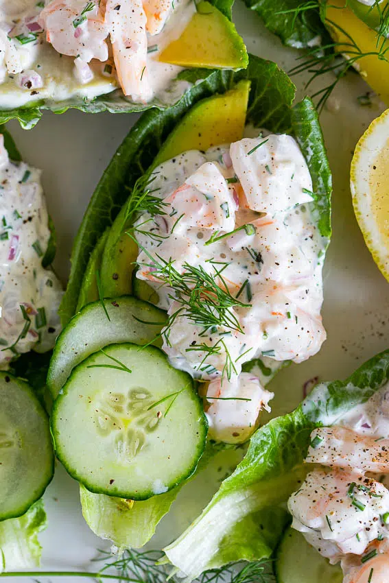 You’re going to love this easy, creamy shrimp salad recipe flavored with fresh dill, chives and lemon. It makes a delicious, healthy meal served in lettuce cups with avocado and slices of cucumber.