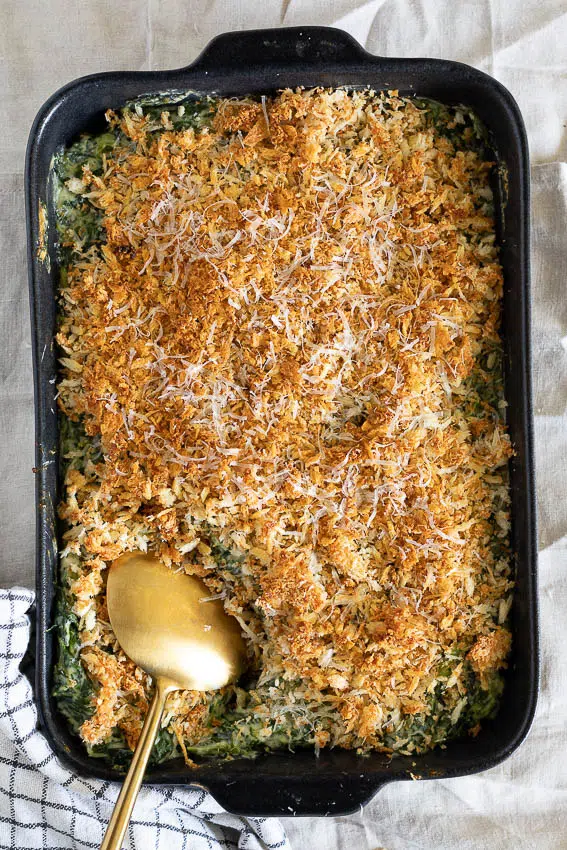 This creamy spinach gratin is an easy but absolutely delicious side dish. It’s as perfect for a simple weeknight dinner as it is a Thanksgiving feast.