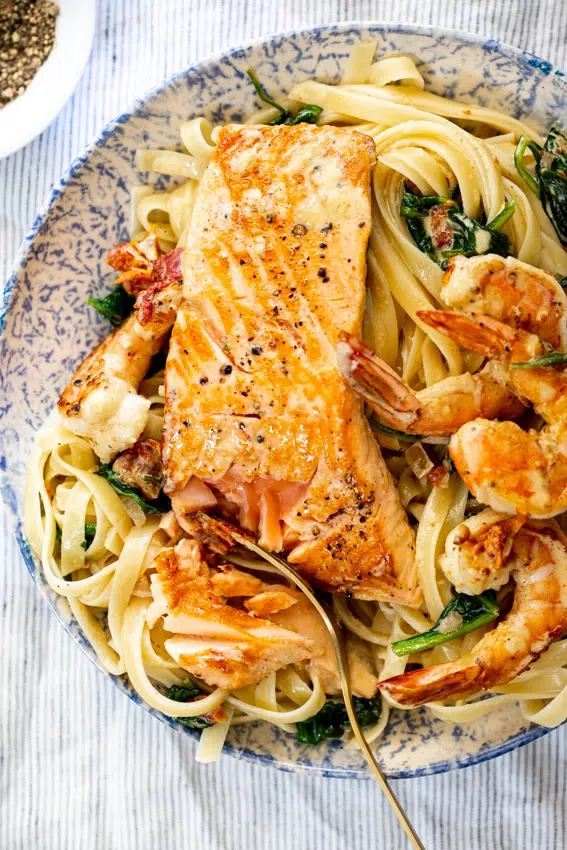 Easy but spectacular, this creamy Tuscan salmon pasta with shrimp, spinach and sundried tomatoes is a delicious dinner recipe.