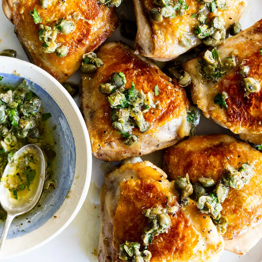 Juicy chicken thighs with perfectly golden, crispy chicken served with lemon caper sauce. So simple but so absolutely delicious. It’s the perfect easy weeknight dinner and requires only a large skillet or pan and a bowl for the sauce. What’s not to love?