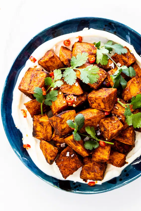 Roasted sweet potatoes have been one of my favorite side dishes for the longest time. Sweet potatoes are always a good idea in my book but when they are flavored with aromatic spices and roasted. Woah mama. They are the perfect side dish to curry and chicken. I also love serving them on seasoned plain yogurt with fresh coriander (cilantro) and sliced chillies. This makes it a delicious addition to a harvest table style lunch and a great vegetarian main.