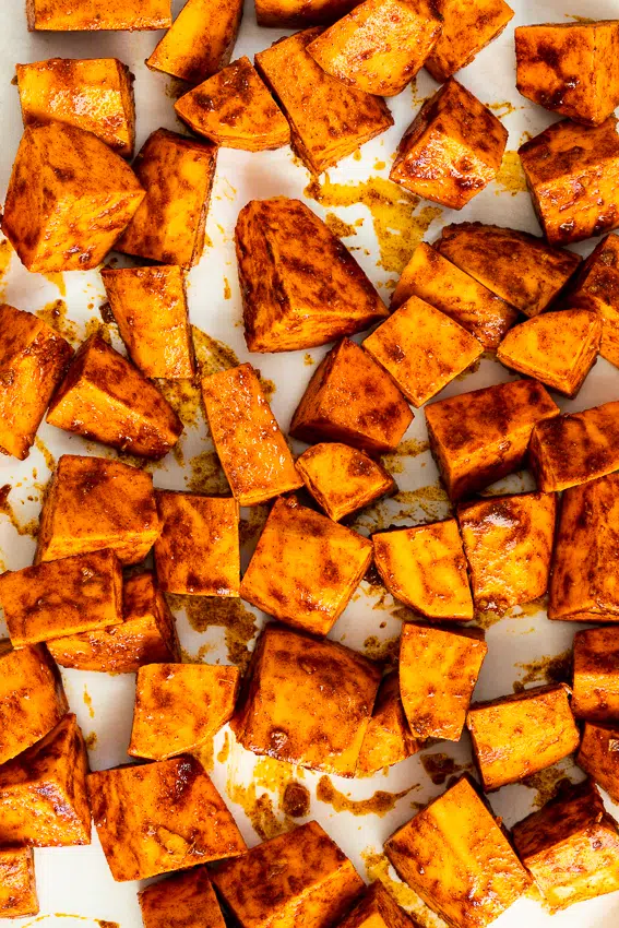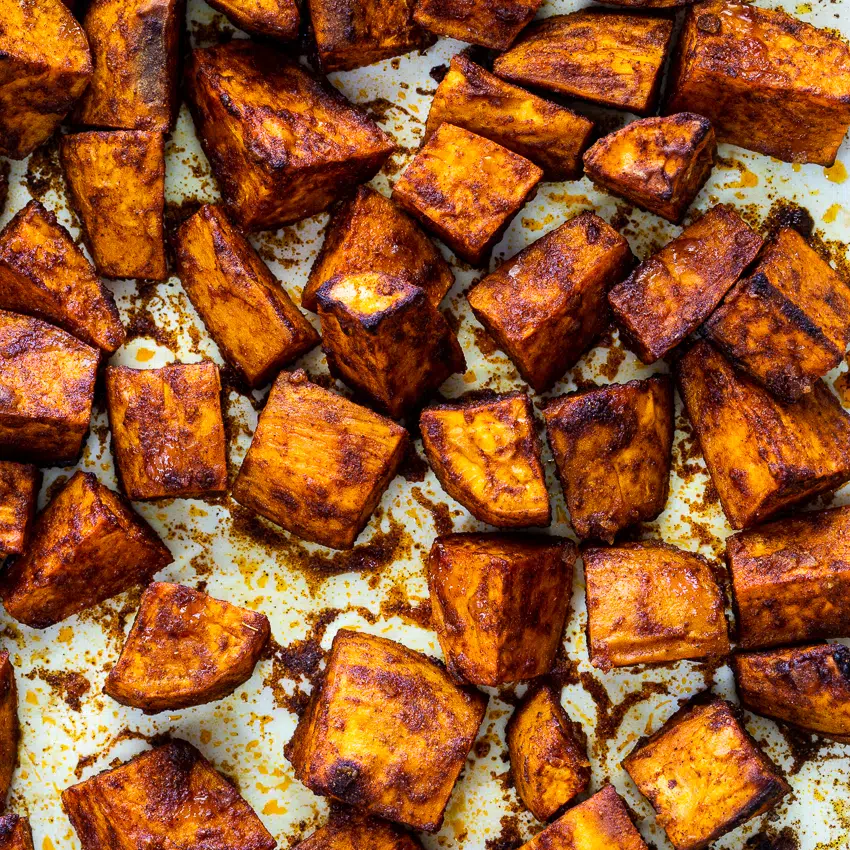 - Transfer the spiced sweet potatoes to a large sheetpan then place in a preheated oven. Allow to roast until the sweet potatoes are soft and starting to caramelize. Remove from the oven and serve.