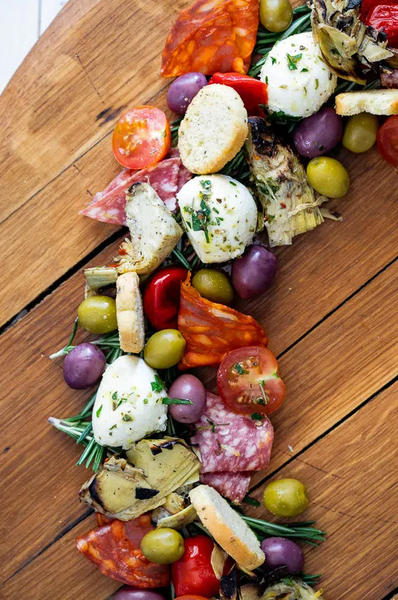 - Arrange the rosemary on a large platter in a circle then add the marinated cheese, pickled and marinated vegetables, meat and olives. Drizzle over the remaining marinade and serve.