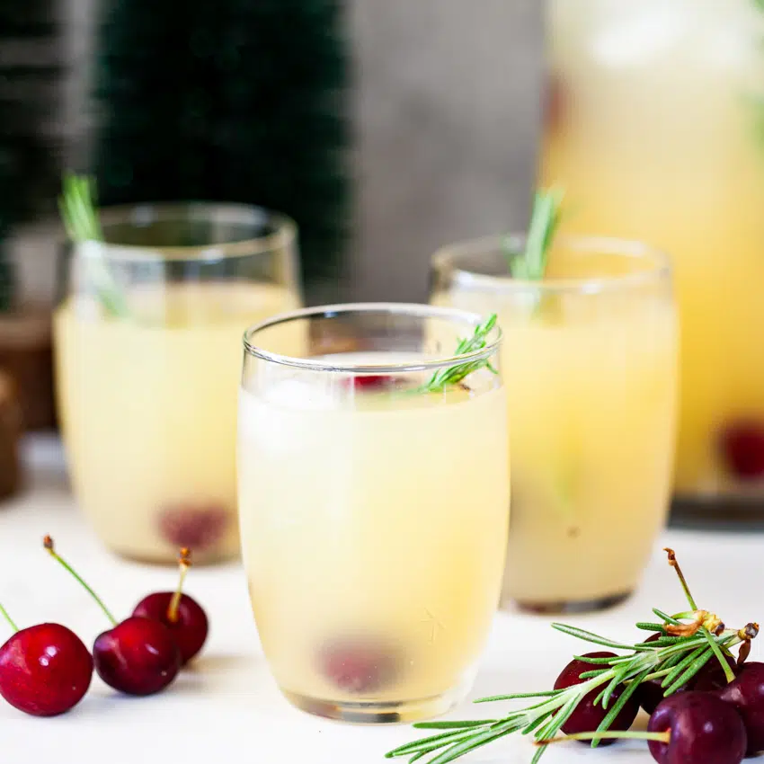- Fresh cherries and rosemary. These are optional but add some festive cheer and the rosemary adds some fragrance to the finished spritzer.