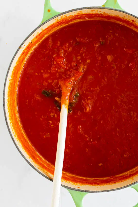 - Cover with the lid ajar and allow to simmer for 30 minutes. Stir regularly with a wooden spoon to prevent the sauce from catching and burning.