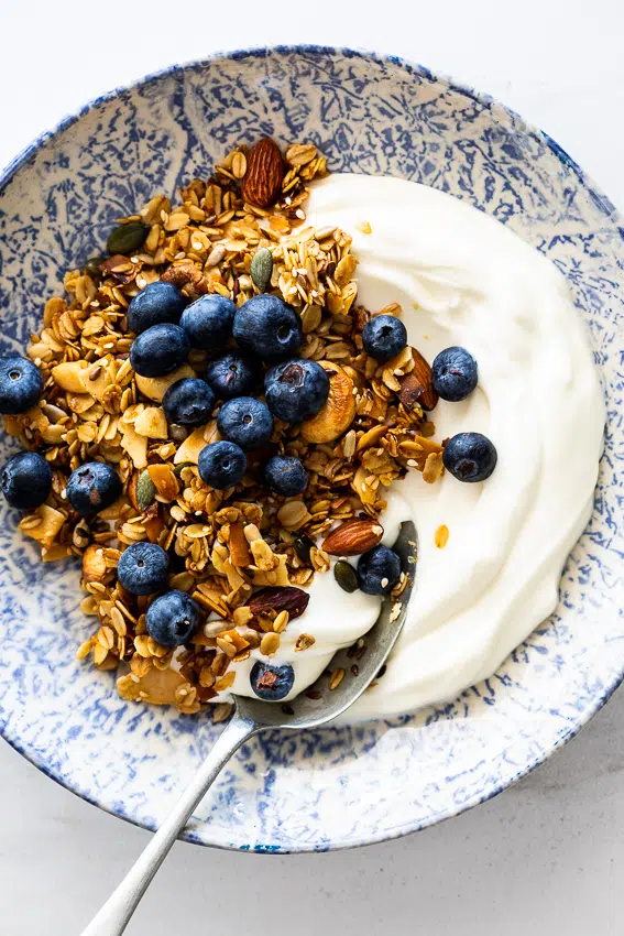 Granola is probably the easiest breakfast there is. Grab a handful, sprinkle it over some yogurt and add fresh fruit. Done! However, store bought granola can be full of sugar, salt and oil so I prefer making my own. It helps that homemade granola is one of the easiest recipes you can make. Mix all the ingredients up in a big bowl then bake until golden and crisp. Store in a jar and voila. No more excuses not to have a healthy breakfast every morning.