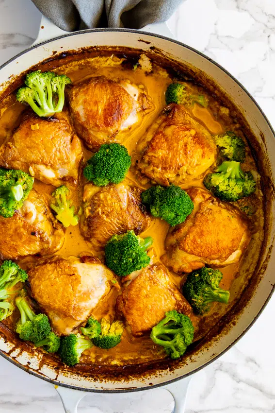 These coconut curry chicken thighs are everything you want from a weeknight curry. Crispy-skinned chicken in a rich, aromatic coconut sauce loaded with warm Indian spices, finished with tender broccoli and served over rice. The whole thing comes together in under 30 minutes and tastes like something that took all afternoon.
