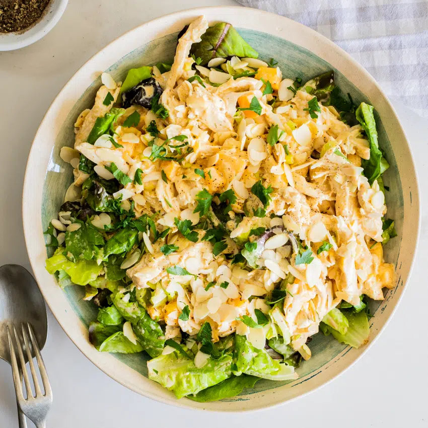 This easy Coronation Chicken salad with creamy, curried dressing, peaches and almonds is the perfect lunch or simple dinner recipe. A guaranteed crowd pleaser served with crusty bread.