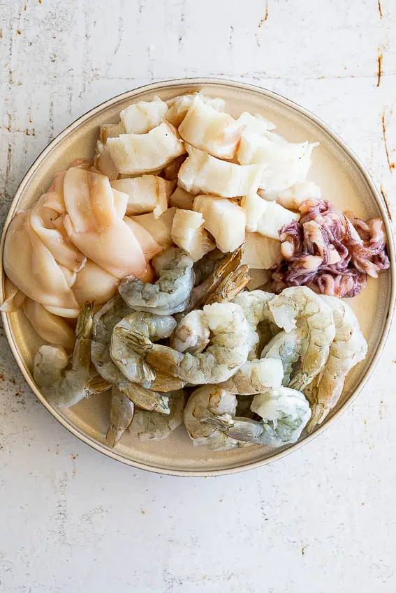 - Start by preparing the seafood. Peel and devein the shrimp, cut the fish into chunks and make sure the calamari is clean.