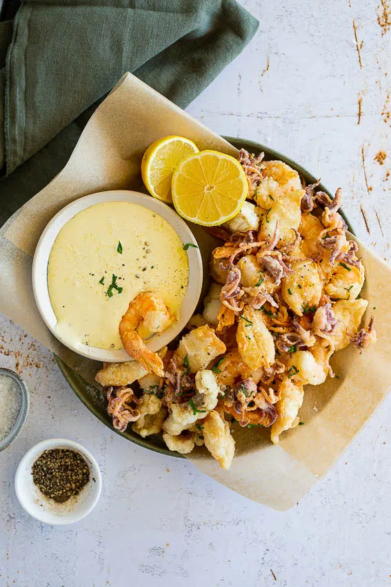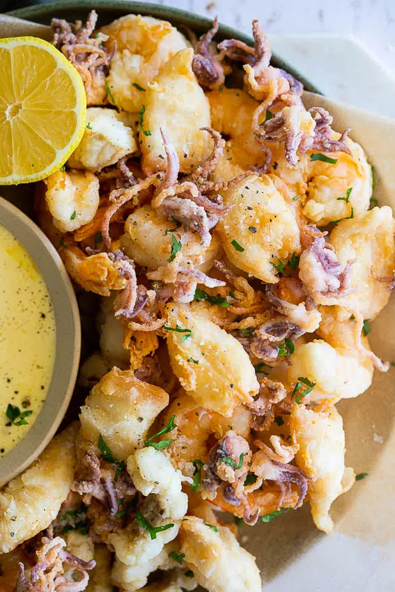Easy Italian Fritto Misto with calamari, shrimp and white fish is the most delicious appetizer or fuss-free lunch recipe served with lemon aioli for dipping.