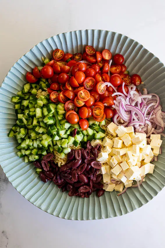 - Cube the feta cheese then add all the ingredients to a large bowl with the orzo.