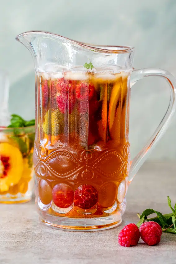 Add any juice of your preference (for a clear iced tea I like using apple juice but passionfruit, peach, apricot and berry juices are all excellent). At this point you can add ice and keep in the refrigerator. This is the way I make it 98% of the time but when I’m making iced tea for an event or for guests, I like to add fresh fruit. The fruit adds flavor but also makes the ice tea so pretty. Sliced peaches/nectarines, strawberries, raspberries, pomegranate and lemon are all great additions. Herbs are also great and mint, rosemary, lavender, thyme and basil will all be delicious.