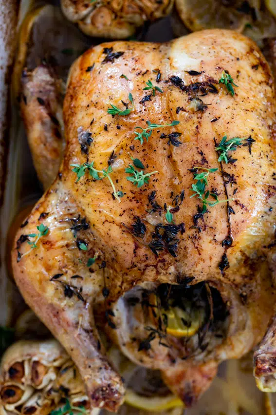Juicy lemon roasted chicken flavored with thyme and garlic is the most delicious, easiest way to cook a whole chicken. This recipe is also fantastic to make ahead as the leftovers are fantastic on everything from salads to sandwiches.