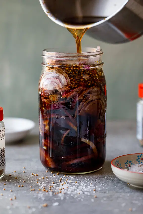 For this batch, I flavoured the pickles with mustard seeds, coriander seeds, dried oregano and used a good splash of Balsamic vinegar. The end result was a deeply aromatic pickle with a lot of savory notes, which I really loved. That’s the beauty of making your own pickled red onions, you get to play around and change the ingredients which results in a different tasting pickle every time.